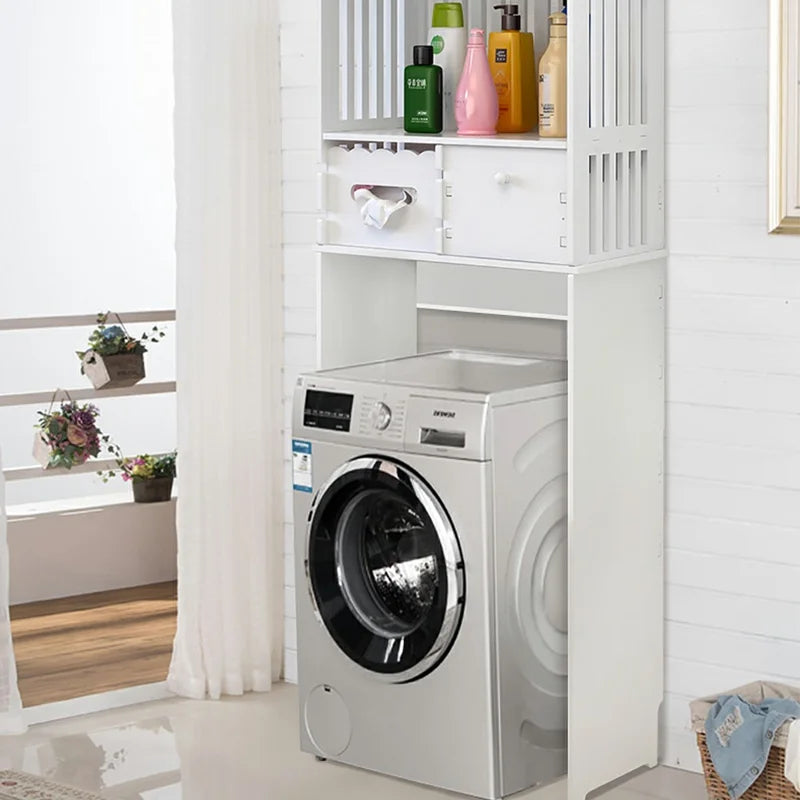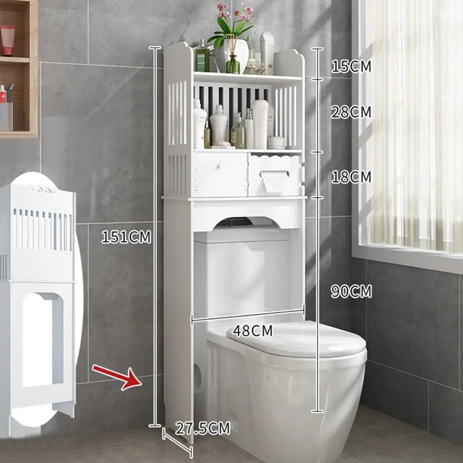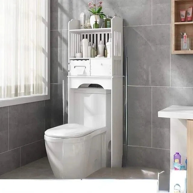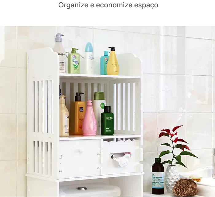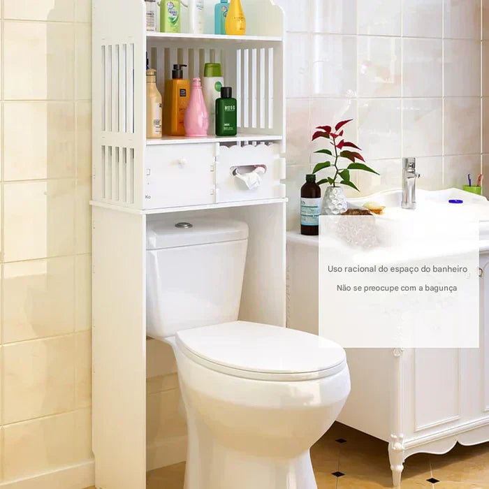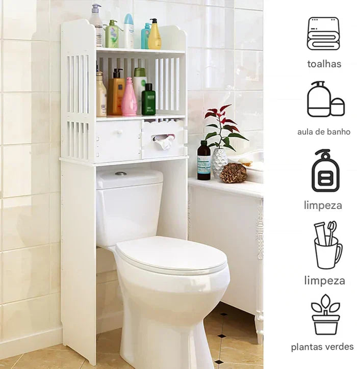 Com um design vertical e multifuncional, ele se encaixa perfeitamente sobre o vaso sanitário, criando novos níveis de organização para toalhas, cosméticos, papel higiênico, produtos de limpeza e muito mais.