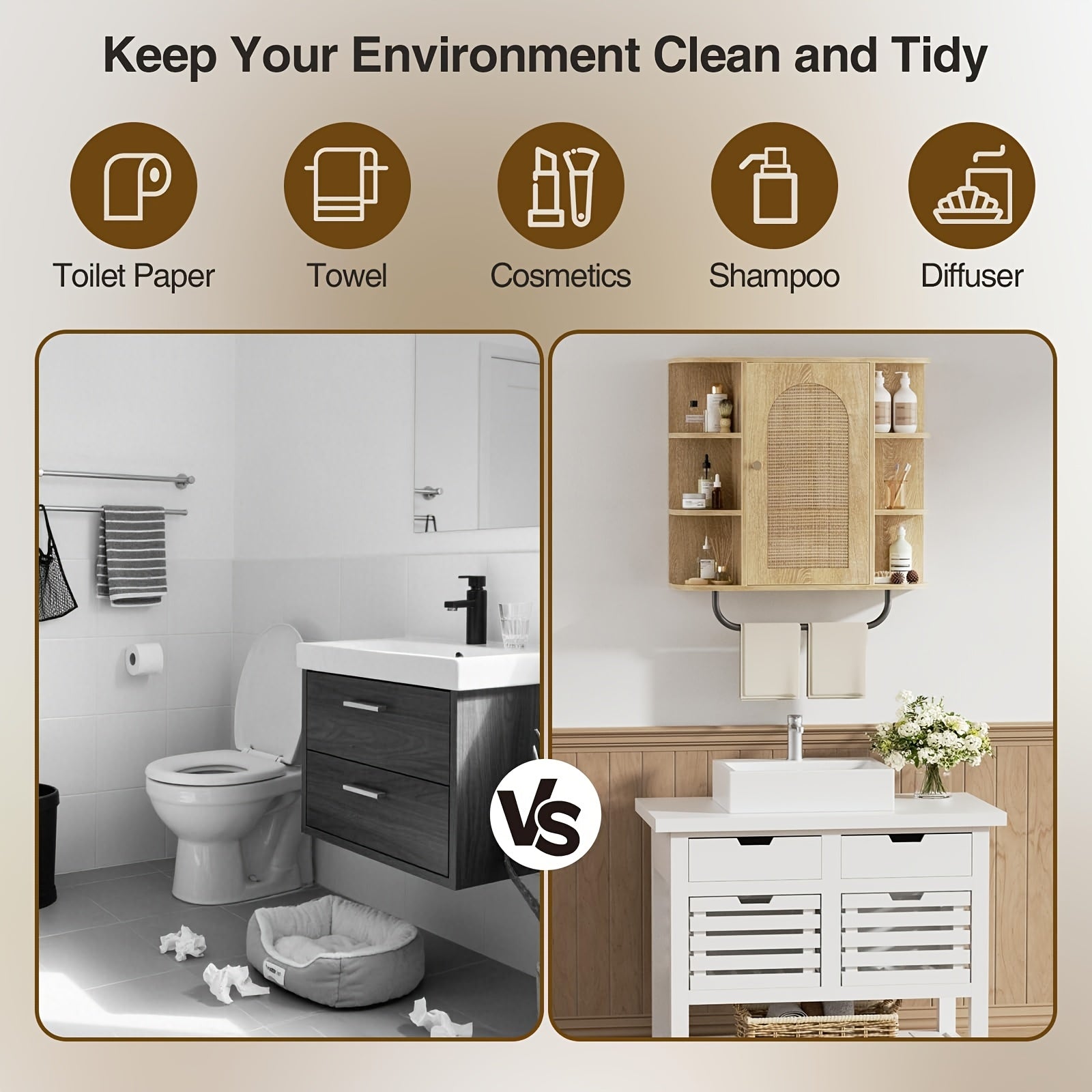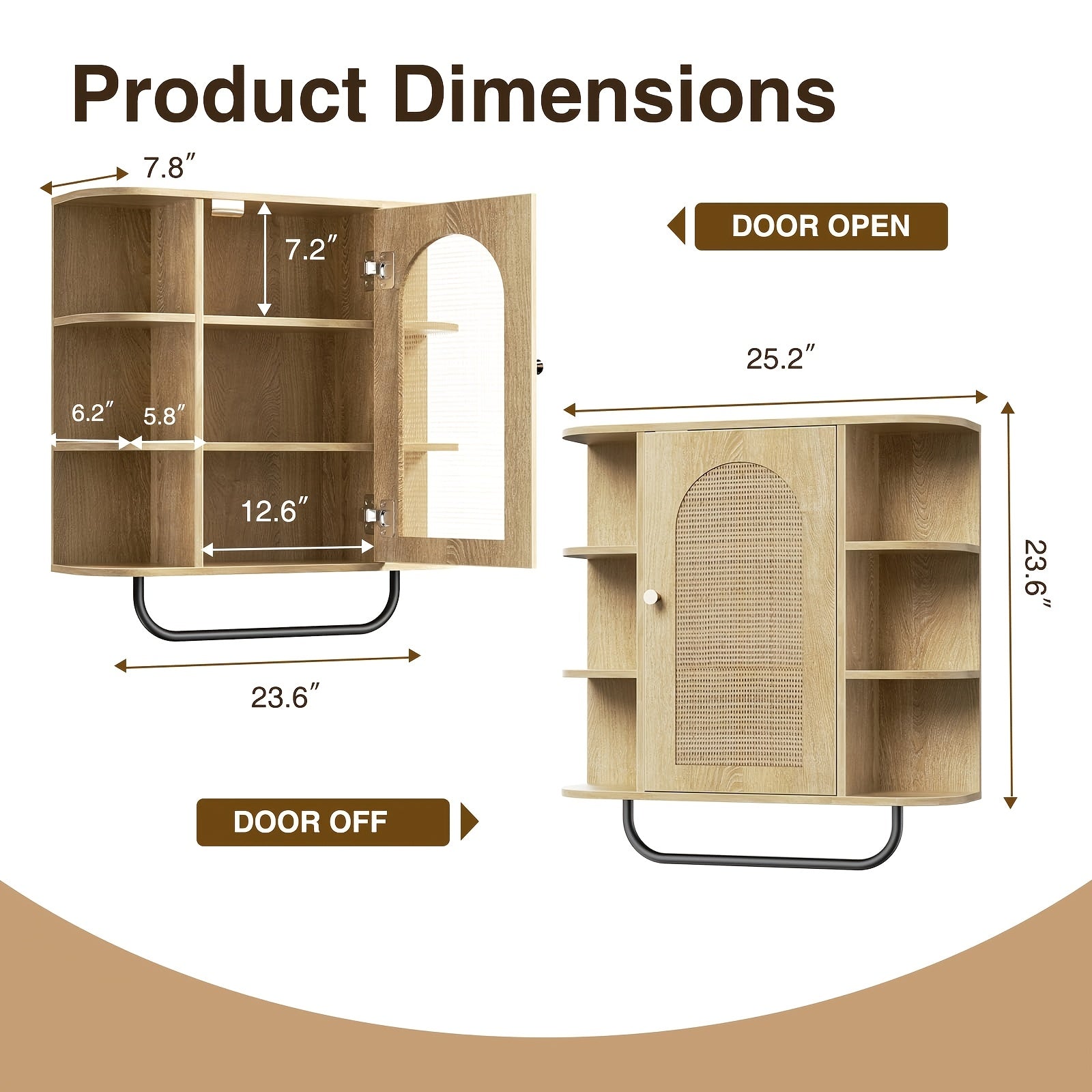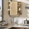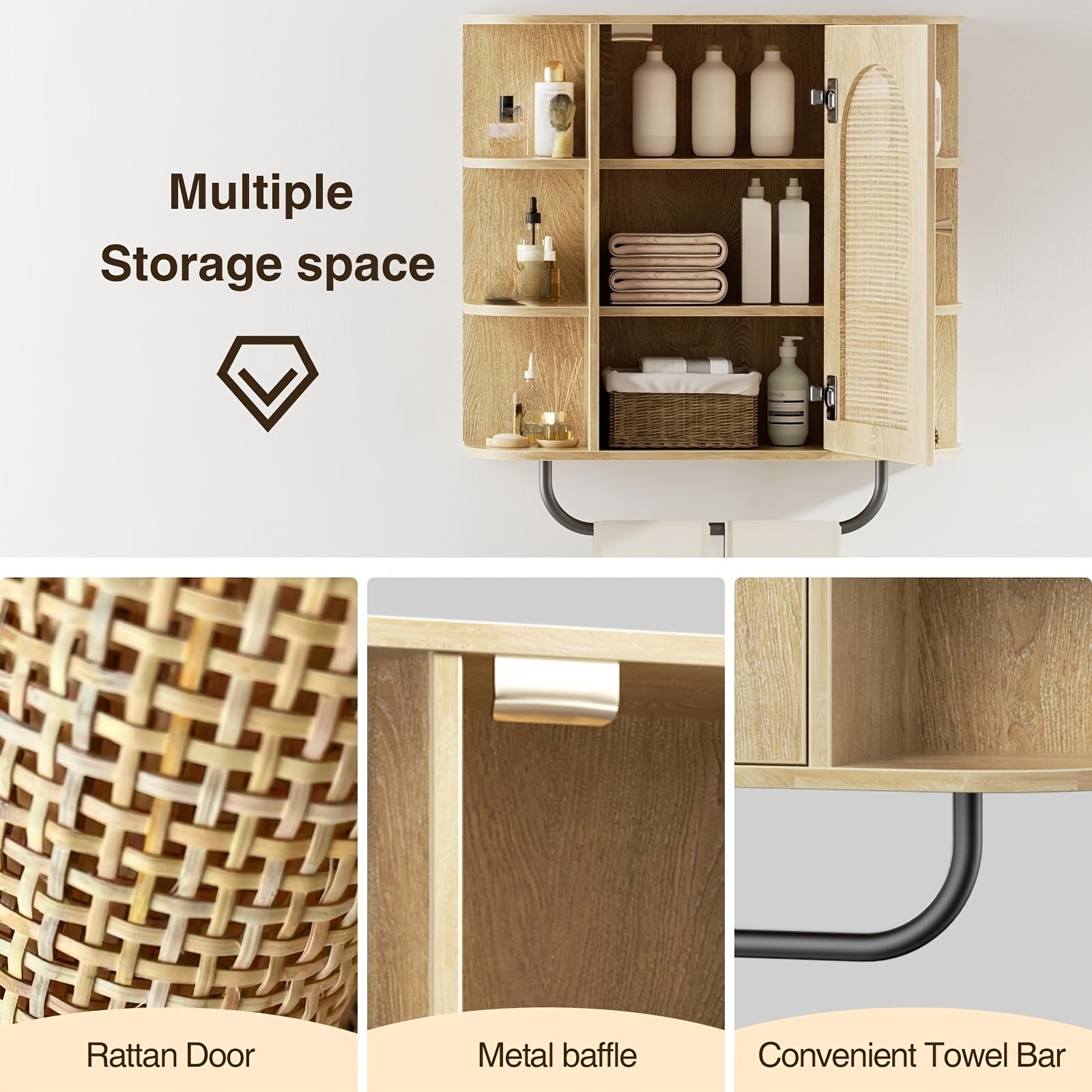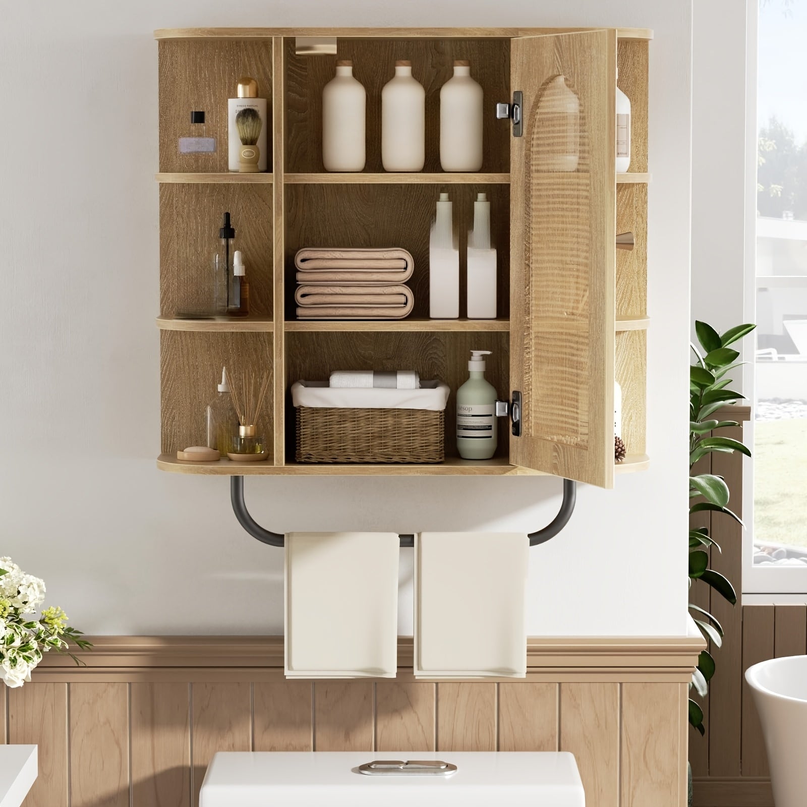 Armário de Banheiro de Rattan Montado na Parede com Barra de Toalha