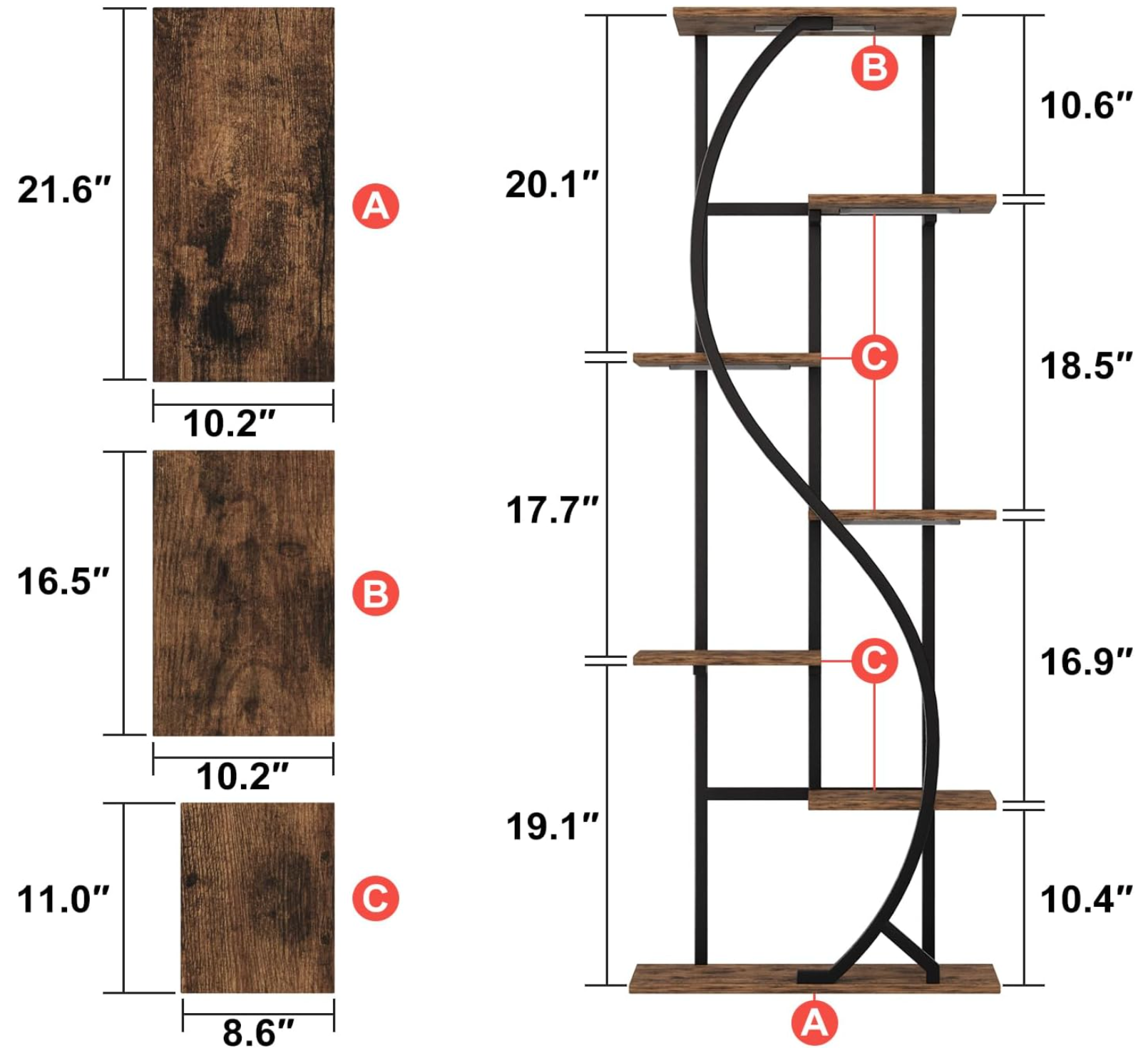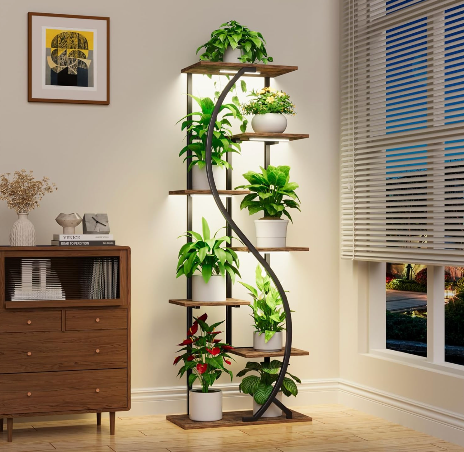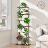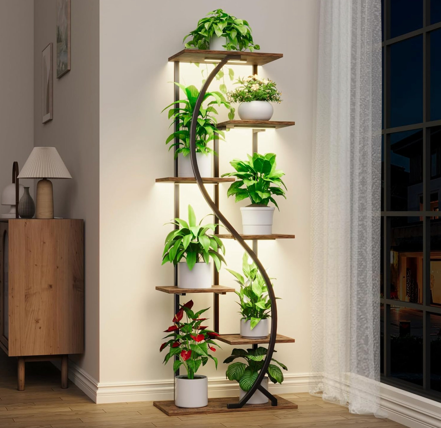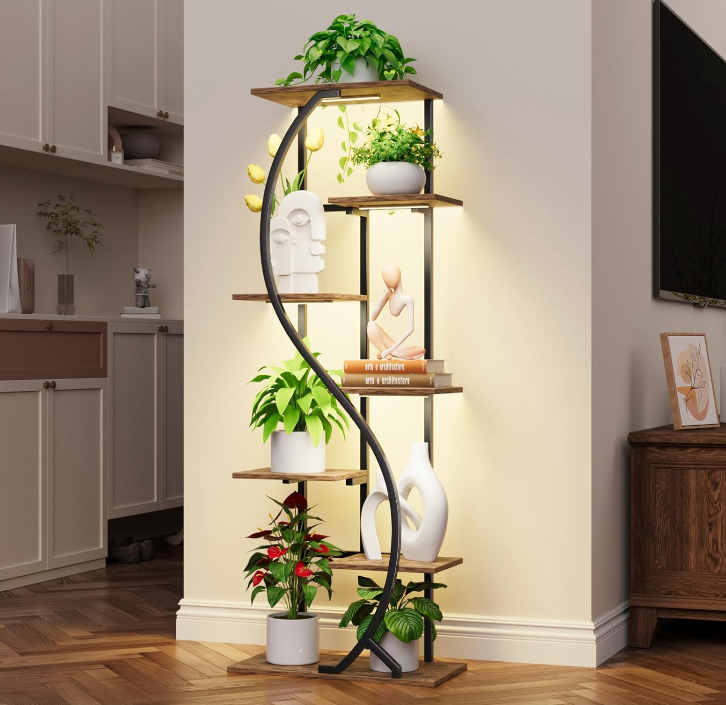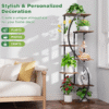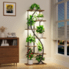 Step into a world where design and nature entwine with the Verdanza Archway. This striking plant stand features a flowing S-shaped metal frame, guiding the eye along six floating tiers of warm wood shelves. Each level is perfectly poised to highlight your favorite plants, creating a vertical oasis of calm and vitality.